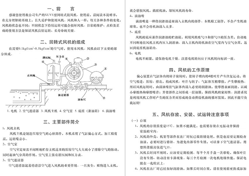2、HF回轉(zhuǎn)式鼓風(fēng)機(jī)結(jié)構(gòu)精巧,主要由電機(jī)、空氣過濾器、鼓風(fēng)機(jī)本體、空氣室、底座(兼油箱)、滴油嘴六個(gè)部分組成。